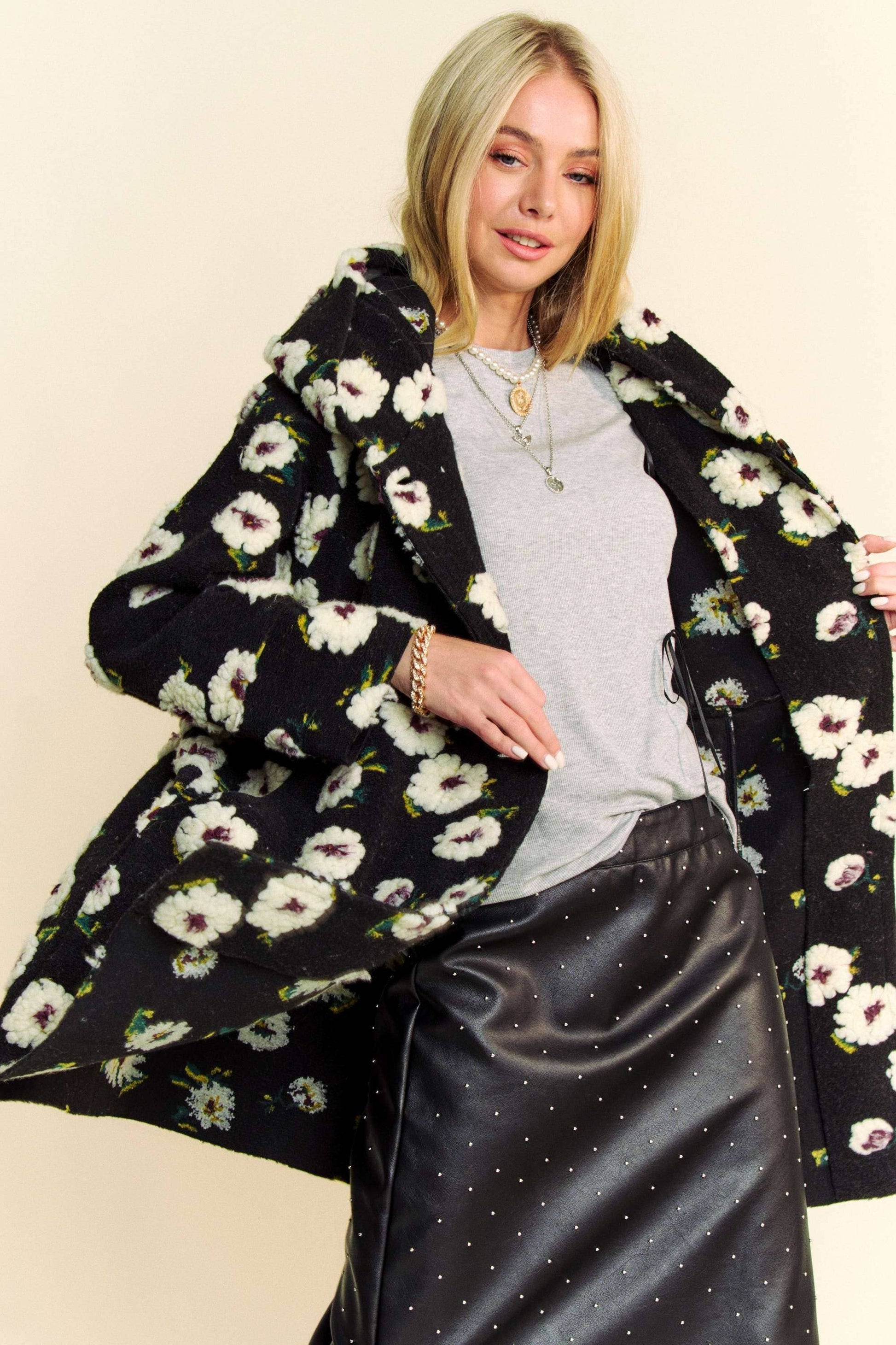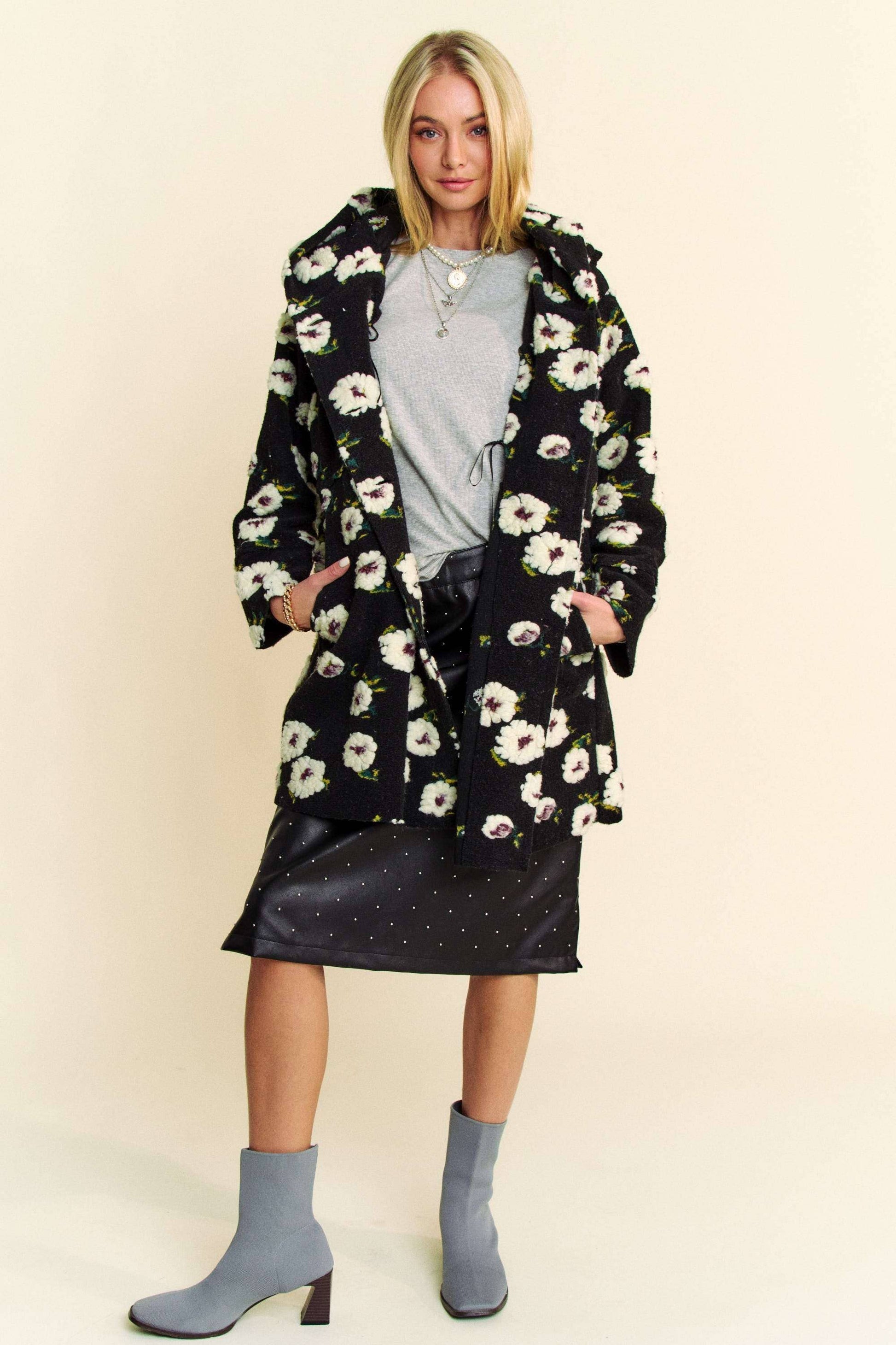 With its black base and delicate white floral print, this jacket blends effortless style with an easy, lived-in feel. The slightly oversized fit makes it perfect for layering over your favorite tee or hoodie — comfy enough for the barn, cute enough for town.