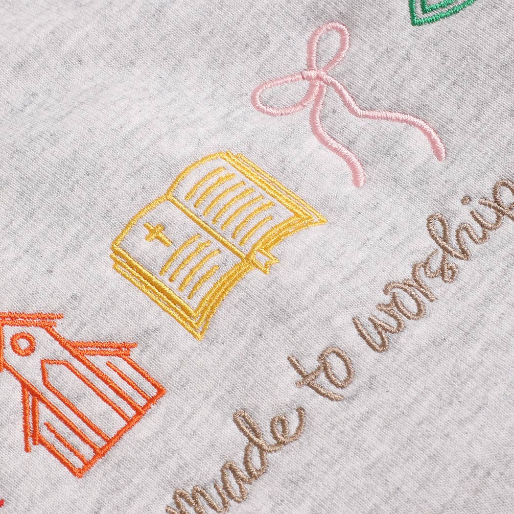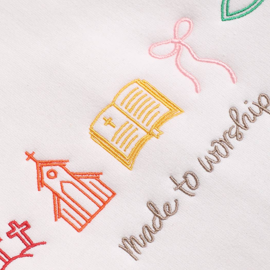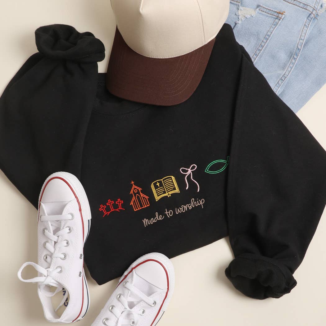 A faith-inspired heavyweight sweatshirt featuring colorful line-art embroidery of crosses, church, Bible, ribbon, and ichthys symbol, paired with “Made to Worship” lettering for a meaningful, uplifting, and expressive everyday style. This heavyweight crewneck sweatshirt is crafted with warm fleece and a durable finish for lasting comfort. Made from a 50% cotton and 50% polyester blend, it offers both softness and strength, making it a versatile everyday essential. Professionally customized in the USA, it features clean embroidered detailing that adds timeless style. Available in unisex sizes S–XL, it provides a comfortable fit for everyone.